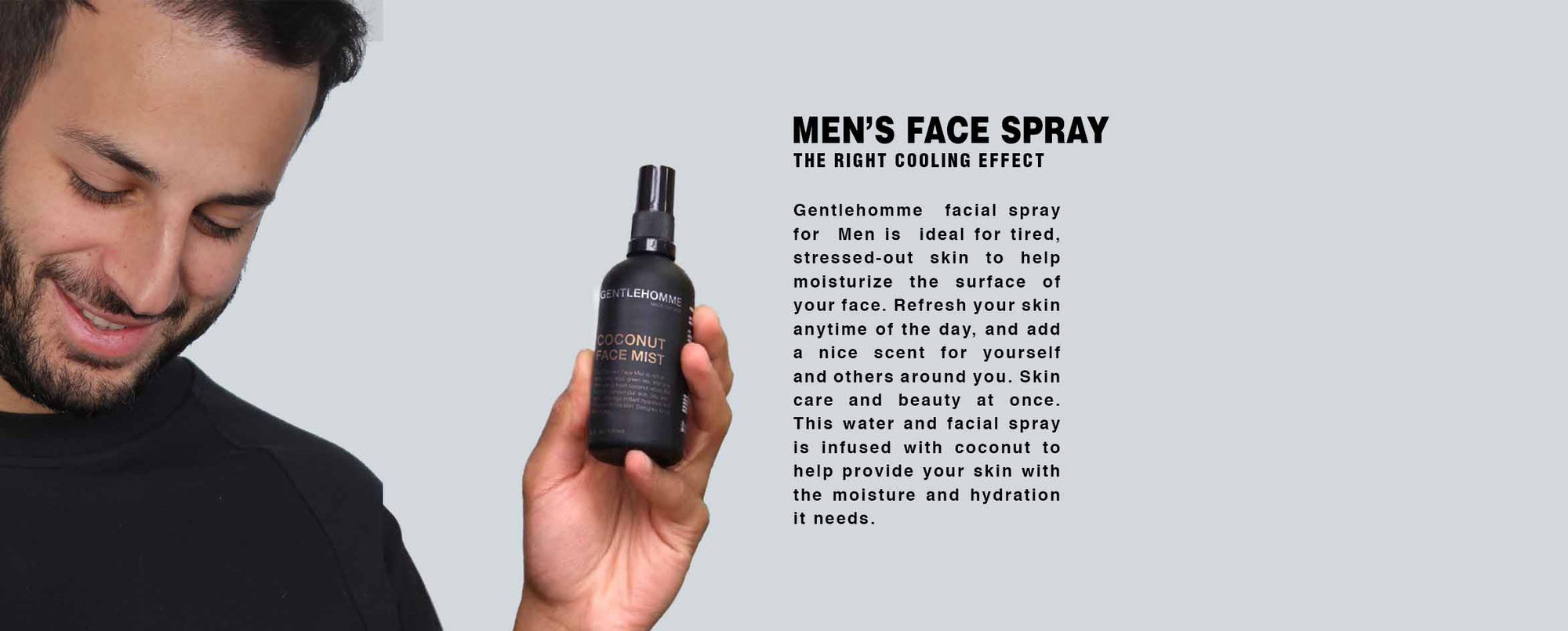 - Soothing face mist for men that moisturizes, hydrates, and soothes your facial skin with a coconut scent and cooling effect.